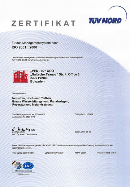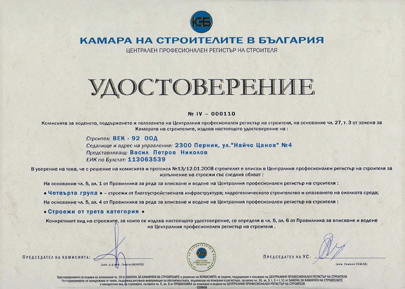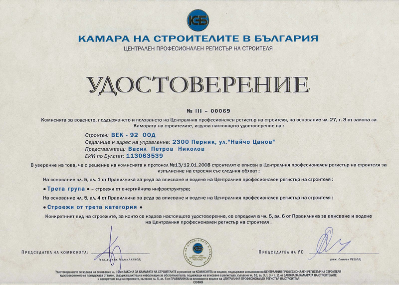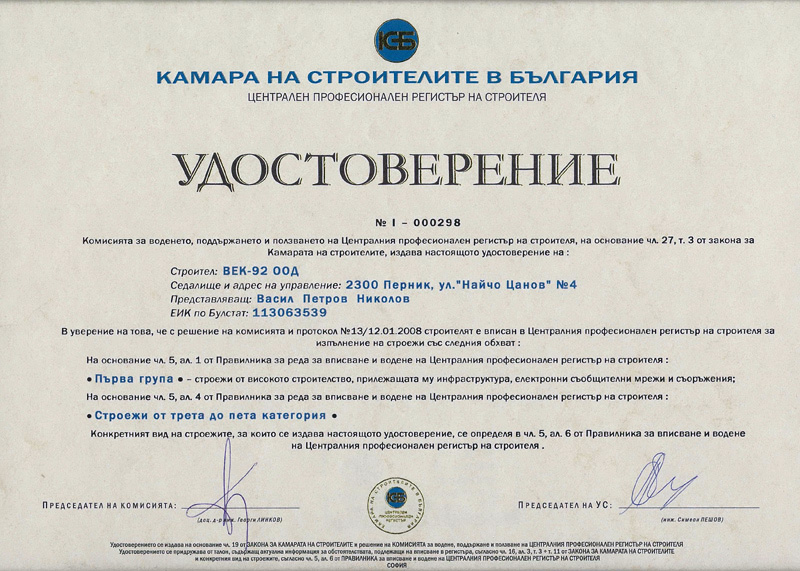 Фирма "ВЕК-92" гр. Перник е образувана през месец август 1992 год. като Консорциум "ВЕК". Той е създаден с граждански договор за осъществяване на определена съвместна дейност на ЕТ "Кирил Кирилов – Д", представлявано от ръководителя инж. Кирил Велизаров Кирилов и ЕТ "Васил Николов", представлявано от инж. Васил Петров Николов. Консорциумът извършва съвместна производствена строително-монтажна, стопанска и търговска дейност.